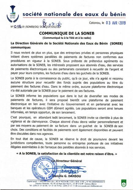 COMMUNIQUE D'ALERTE a/s PAIEMENT DES FACTURES PAR DES TIERS
